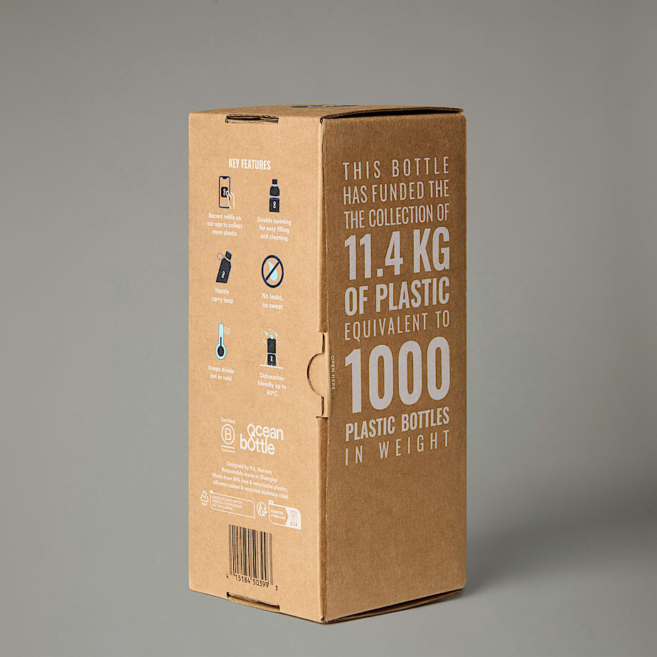 • Made from double-wall, vacuum-insulated stainless steel that's ultra-tough, the 0.65-litre X Ocean Bottle water bottle is cleverly designed to keep your cold drinks cold and hot drinks hot. It has a dual opening for ice and easy cleaning, it won't leak or sweat in your hiking backpack, and it's 100% dishwasher safe. It's made from a mix of recycled materials and ocean-bound plastic, too, helping to keep our oceans safe. The reusable water bottle is created in partnership with Ocean Bottle. With the sale of every Ocean Bottle, we prevent the equivalent of 1,000 plastic bottles from reaching the ocean. The bottle includes an embedded NFC base plate in the base of the bottle, which can be scanned to allow individuals to track their refills and plastic collection contribution through the Ocean Bottle app.